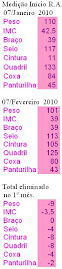 Minha meta era chegar aos 70Kgs até o meu aniversário que foi no dia 08/Junho; infelizmente não deu, hoje ainda estou nos 96, em alguns momentos esqueci completamente da R.A., mas agora vou a academia pelo menos 3 vezes na semana, e só agora por cerca de 1 mês é que realmente passei a frequentar, antes sempre tinha uma desculpa, mas superei isso e to aprendendo até a gostar, rsrsr. Nos dias que não posso ir, sinto até falta e tô fazendo também a Dança do Ventre, e é muito, muito legal mesmo e bem cansativo, mas eu guento, kkk. Mas ainda não desisti dos 70, tudo ao seu tempo!!!